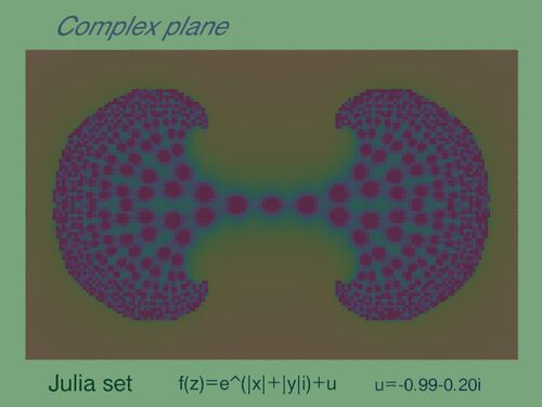 ジュリア集合のフラクタル図形をレンダリングしました ジュリア集合 μ-map 【式】 ジュリア集合 μ-map 複素数 z=x+yi とします f(z) = e^(|x|+|y|i) + μ , μ = - 0.99 - 0.20 i 描画範囲 実数 < -0.88 ~ 0.88 > 虚数 < -1.40 ~ 1.41 > 縦長のフラクタル図形…